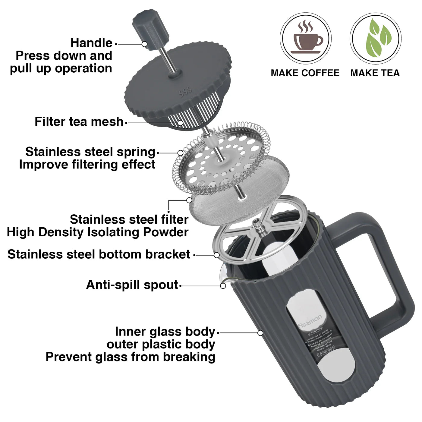The borosilicate glass carafe is resistant to thermal shock, ensuring it remains crack-free even with rapid temperature changes. It’s easy to clean, dishwasher-safe, and built to last, offering an eco-friendly, waste-free alternative to disposable coffee filters or pods. Sleek and functional, this French press is a must-have for any coffee or tea enthusiast.